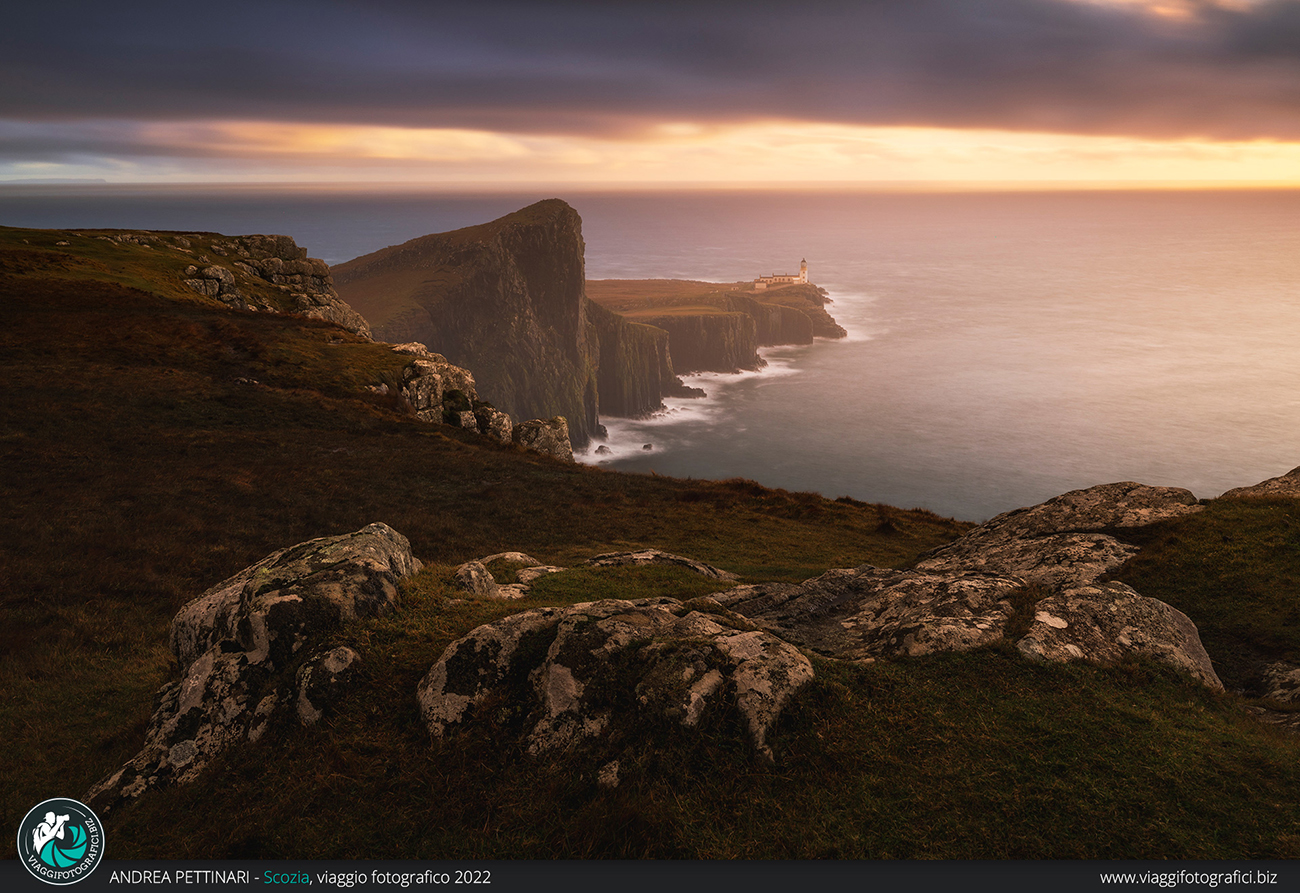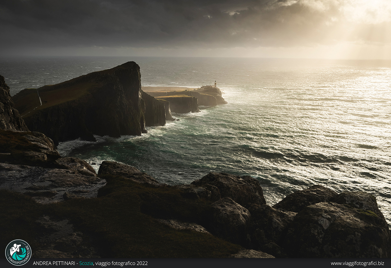 Pioggia battente, cascate che invertono la rotta e risalgono la scogliera seguendo il vento impetuoso, nuvole basse, nebbia… poi, tutto d'un tratto, il cielo si apre, il sole squarcia le nubi e una luce calda radente illumina il faro di Neist Point. Il vento non c'è più, il freddo è solo una sensazione e rimane solamente il calore dato dalla bellezza di un paesaggio surreale.