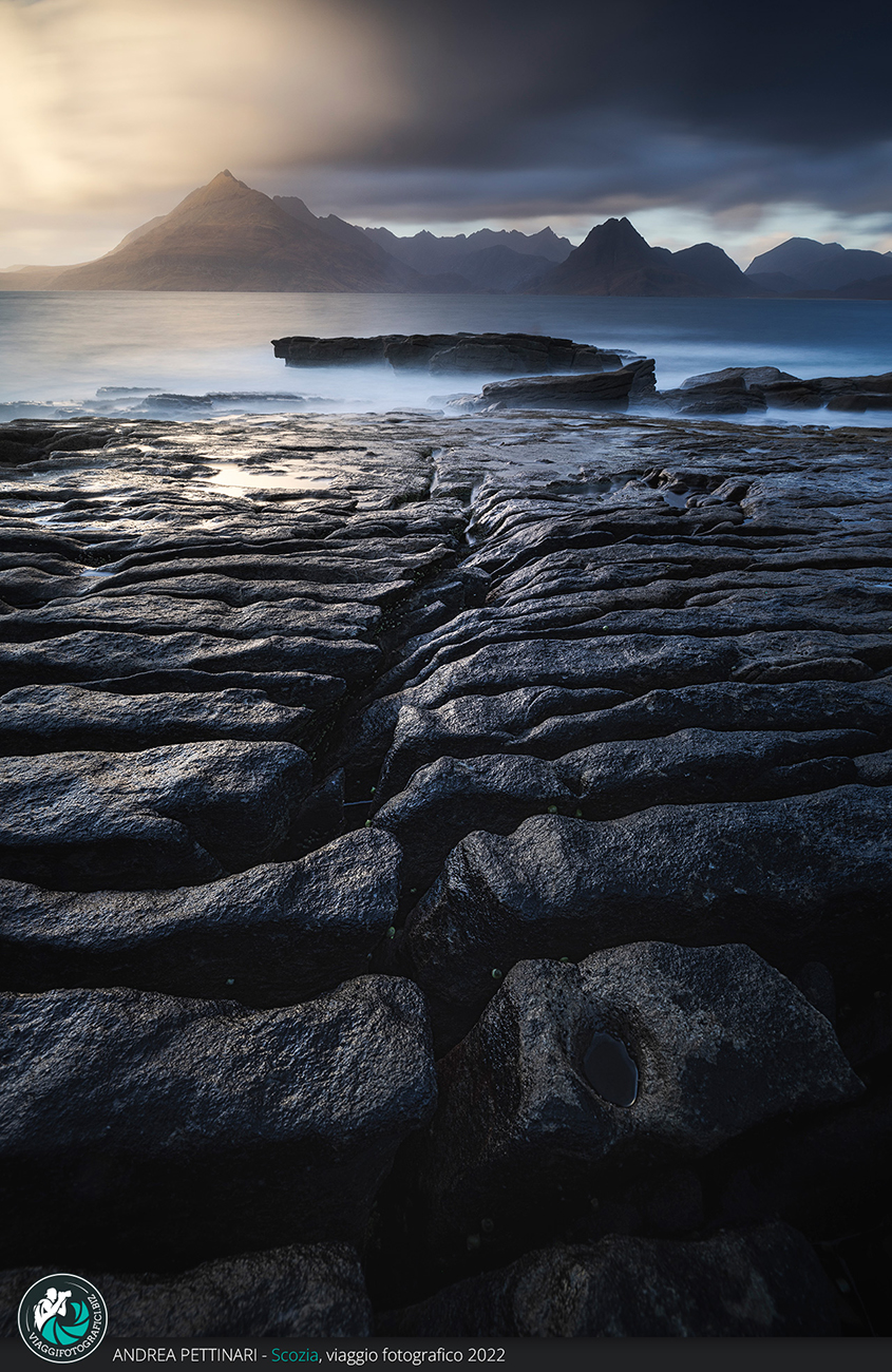 Dopo tutto questo belvedere si raggiunge un piccolo porticciolo, e sì, ci rendiamo subito conto che la struttura di fronte alla spiaggia è una scuola e, di comune accordo con il gruppo, nella prossima vita vogliamo rinascere qui e passare l’infanzia a giocare di fronte ad Elgol. La scogliera è magnifica, rocce ricche di dettagli e le incredibili montagne sullo sfondo. Gli scatti sono un qualcosa di epico.