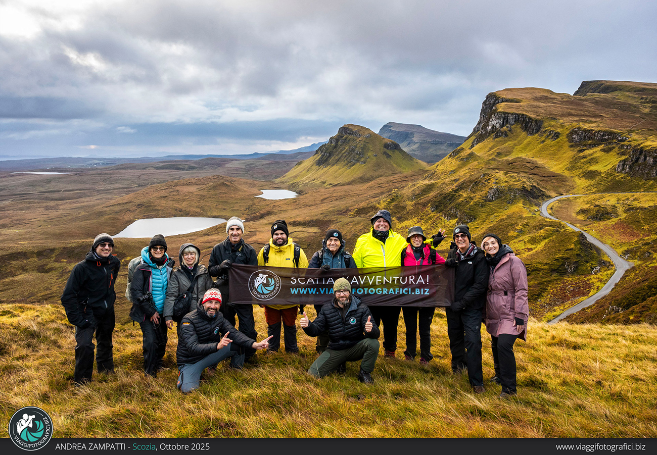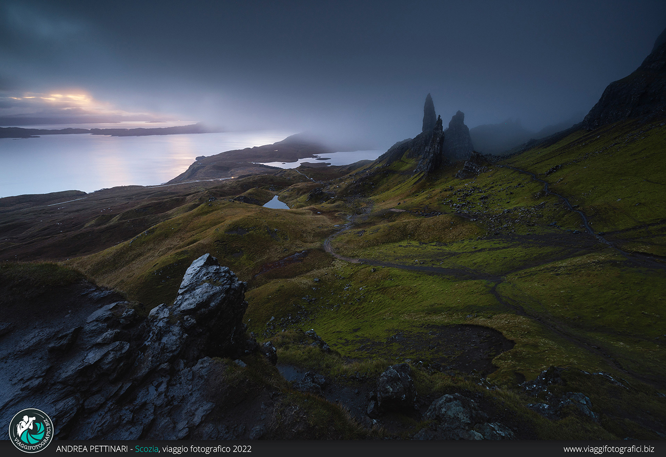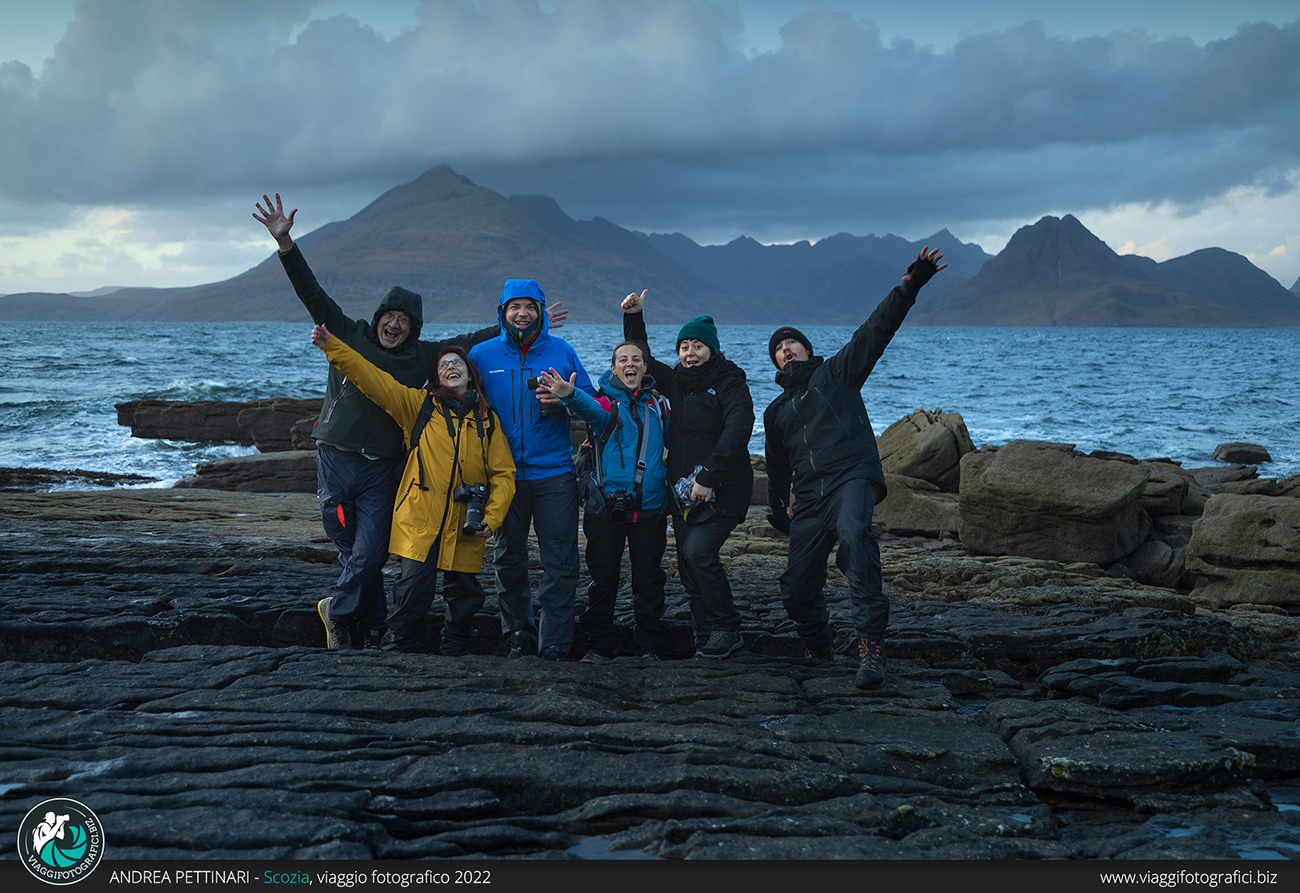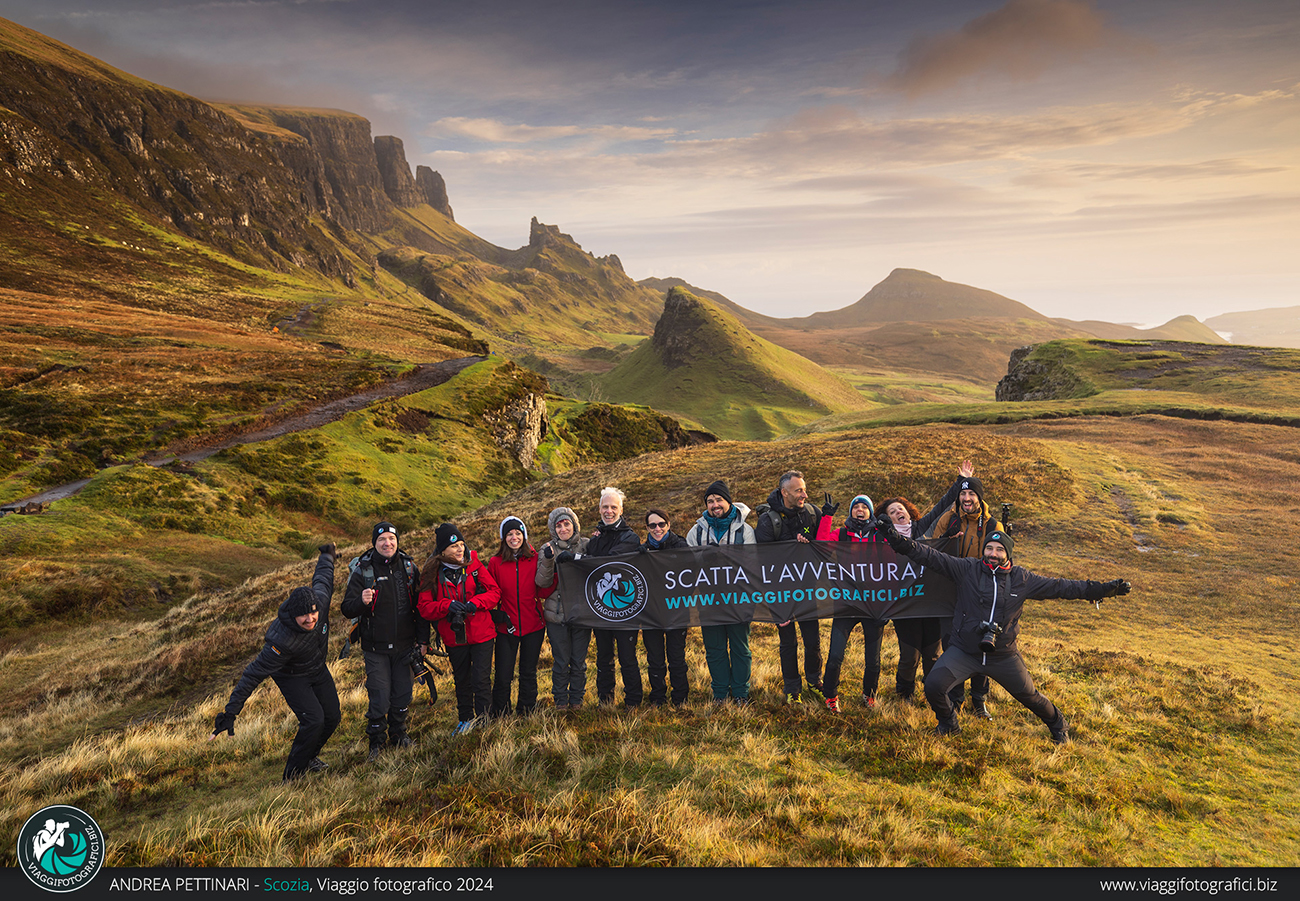 Altra perla indiscussa di quest’isola, anzi, il luogo più incredibile che visiteremo, è l’Old Man of Storr all’alba! Finalmente posso sfoggiare la frase più falsa che pronuncio in ogni viaggio: “poi spiana”, entrata a far parte ormai del folclore di Viaggi Fotografici. Trascorrendo più notti sull’isola, abbiamo modo di decidere quando fare il trekking, sfruttando la giornata con il meteo migliore. Partiamo al buio, accompagnati dalla notte che nasconde la salita che abbiamo innanzi. In poco più di un’ora raggiungiamo l’anfiteatro di monoliti che creano un ambiente alieno. È impressionante sentire l’eco senza vedere la bellezza del luogo e, non appena la luce inizia a rischiarare il paesaggio, riesco ad ammirare lo stupore negli occhi dei partecipanti che vedono per la prima volta questo luogo unico al mondo. Se in più il meteo è dalla nostra, il gioco è fatto!