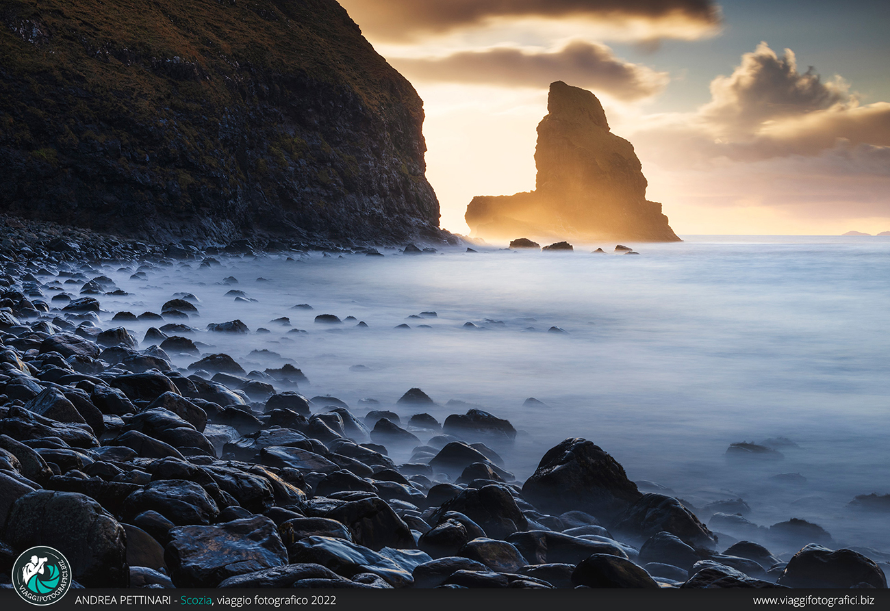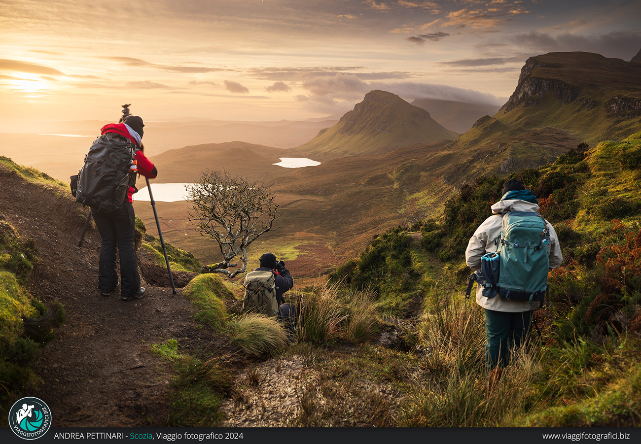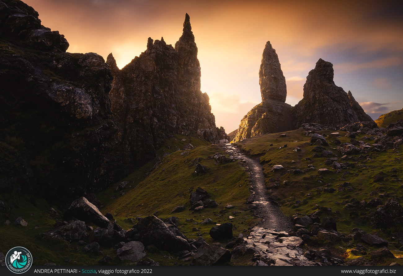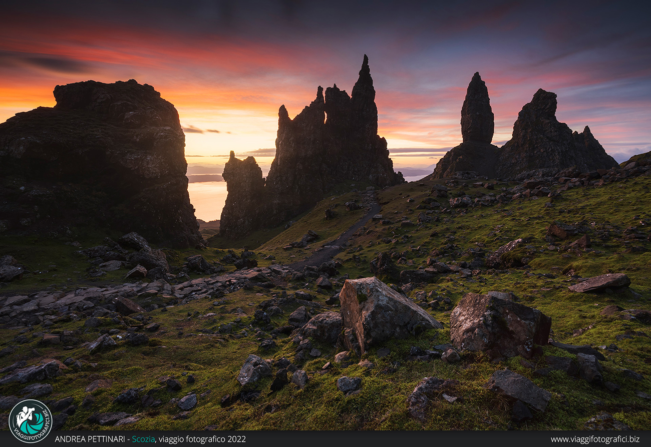 Altra perla indiscussa di quest’isola, anzi, il luogo più incredibile che visiteremo, è l’Old Man of Storr all’alba! Finalmente posso sfoggiare la frase più falsa che pronuncio in ogni viaggio: “poi spiana”, entrata a far parte ormai del folclore di Viaggi Fotografici. Trascorrendo più notti sull’isola, abbiamo modo di decidere quando fare il trekking, sfruttando la giornata con il meteo migliore. Partiamo al buio, accompagnati dalla notte che nasconde la salita che abbiamo innanzi. In poco più di un’ora raggiungiamo l’anfiteatro di monoliti che creano un ambiente alieno. È impressionante sentire l’eco senza vedere la bellezza del luogo e, non appena la luce inizia a rischiarare il paesaggio, riesco ad ammirare lo stupore negli occhi dei partecipanti che vedono per la prima volta questo luogo unico al mondo. Se in più il meteo è dalla nostra, il gioco è fatto!