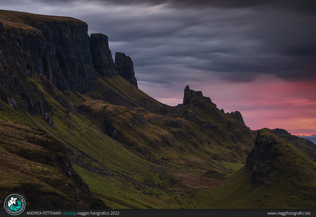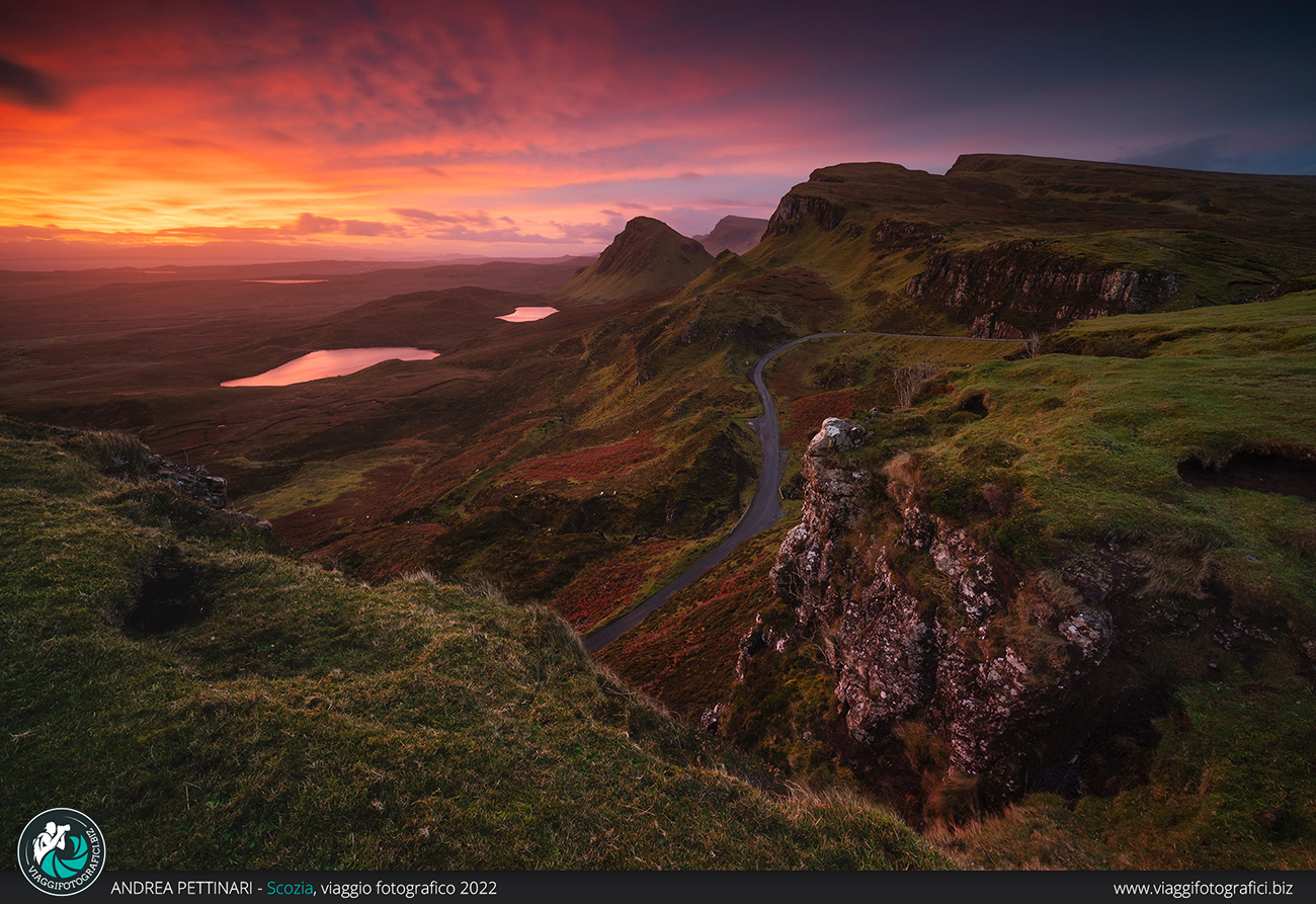 La bellezza dell’Isola di Skye non finisce qui, un altro luogo iconico si nasconde dietro l’angolo, il Quiraing, tassativamente all’alba. Questa volta ce la prendiamo comoda, talmente comoda che parcheggiamo l’auto già in quota e ci bastano cinque minuti a piedi per arrivare ad un punto scenico mozzafiato che guarda dall’alto gran parte dell’isola. Ahimè, la mattinata non è delle più favorevoli, il meteo già lo dice, brutto tempo e nuvoloso per tutta la giornata. Ma, impavidi, noi ci tentiamo in ogni caso. E sì, ancora una volta la Scozia ci delizia di un’ulteriore sorpresa, un’infuocata degna di un oscar.