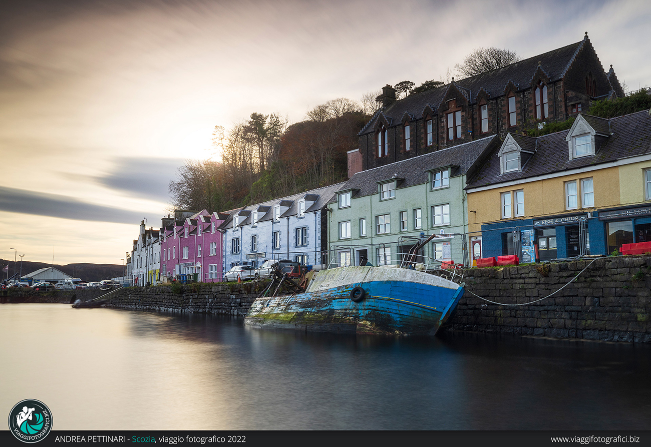 Che bello quando l’alba decide di rendere tutto estremamente facile. Torniamo a Portree per la colazione, ma prima facciamo una doverosa tappa al porto, dove le tipiche casette colorano il paesino e incorniciano una triste barca mezza affondata, bellissima da fotografare; chissà quante storie avrebbe da raccontare se solo potesse parlare.