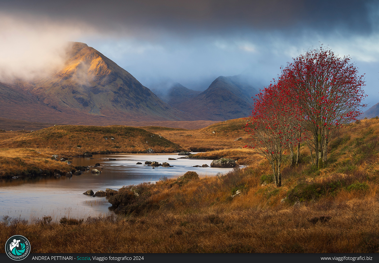 Siamo nelle grandi torbiere, al cospetto delle montagne, la giornata si risveglia dalla lunga notte, si intravede un albero pieno di bacche rosse, che spettacolo! Le nebbie si diradano, le montagne fanno capolino e la luce inizia a dare spettacolo.