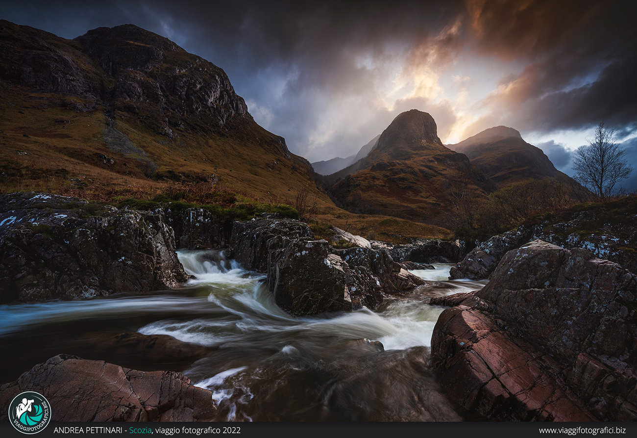E dopo ore di scatti incessanti, ci incamminiamo nel fango, testiamo per bene gli scarponi impermeabili e arriviamo sulle sponde del fiume Etive per il tramonto, ma una coltre di nebbia copre la montagna. Un attimo di sconforto, piove pure, ma basta poco per aprire uno squarcio nel cielo e regalarci un momento di luce d’oro unico. Le nuvole, però, poco dopo si richiudono e le luci del tramonto, purtroppo, non si fanno vedere. E quindi, che si fa? Ovviamente una gustosa cena a base di Fish & Chips, birra a pompa e un goccio di whisky (da non confondere con whiskey, termine utilizzato per i distillati Irlandesi e Americani), il modo migliore per terminare la giornata.